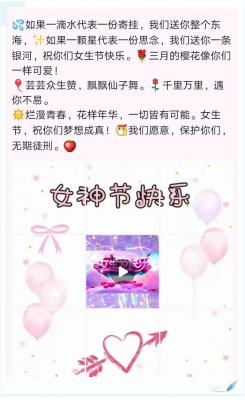 活动消息一经发布,各班男生都积极参加,精心准备。在3月7日女生节当天,各班官Q发布了各具特色的祝福。工商193班的男生们用录制的视频为女生们送去了祝福,如“上网免费,年轻十岁;学习不累,帅哥排队;无所不会,海吃不肥,衣服不贵”,也有简单的“祝小仙女们女生节快乐”。工商195班则将班级女生的一张张照片制作成视频,展现了女生们的风采。俏皮或朴实的话语,再配上温暖可爱的文案,真切地表现出在这个特殊的日子里,男生对女生们的由衷祝福。