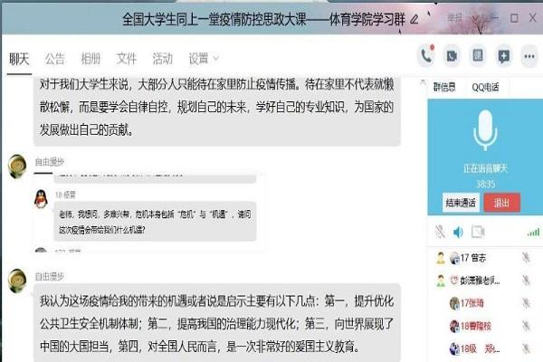 当日下午4时,体育学院邀请马克思主义学院庄秋菊老师参与体育学院关于“全国大学生同上一堂疫情防控思政大课”学习群,为体育学院学子指导讨论、答疑解惑。体育学院分团委副书记彭潇雅、学生会各干事及各班级负责人参与线上讨论提问。
