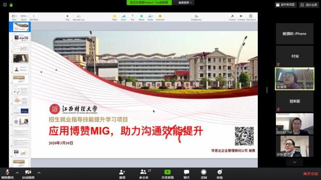 2020年3月10日下午2点30分至5点,招生就业处邀请博赞国际集团有限公司资深顾问谢勇老师通过ZOOM平台线上为招生就业处全处成员及学校专职就业人员共计34人带来了主题为《应用博赞MIG,助力沟通效能提升》的职业技能提升课程。学习过程中,谢勇老师向大家详细介绍东尼博赞和它的思维体系,带着大家一起体验大脑认知基本原理,并教会大家清晰且准确描述MIG的七个核心元素,以及它们和大脑认知原理的联系。通过这次线上课程,大家从中学习了大脑的认知与个人学习效能的关联,尤其是“MIG核心要素应用案例解析”这一环节,大家从中学习掌握在日常工作,包括授课、开会、演讲报告中应用MIG提升沟通效能的方法与技巧,为提高沟通效率、打造有效的人际关系提供了方向,得到参加学习的老师们的一致肯定。