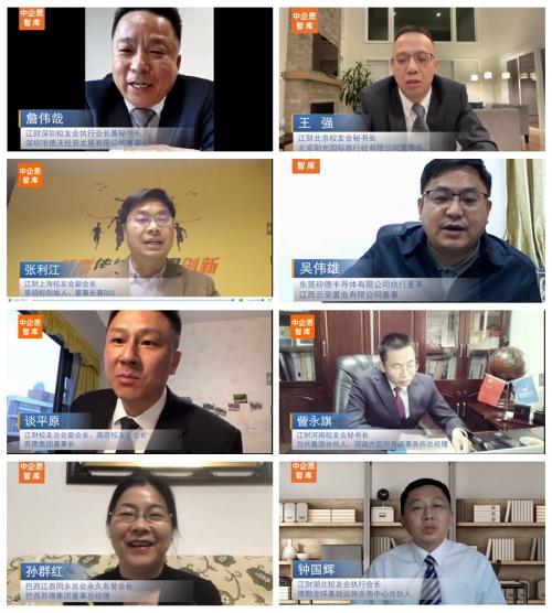 企业代表聂军华、黄健、胡青,各地、各界校友代表訾永旗、詹伟哉、张利江、谈平原、王强、孙群红、杨道威、钟国辉、吴伟雄、张洪刚、古时银等纷纷出席活动为江财打Call。为策划筹备好此次线上直播活动,校招生就业处和校友联络办公室、各校友分会、校友彭湘民运营团队、中企思智库王晓颖助理运营团队等做了大量前期准备工作,确保了活动的顺利开展。