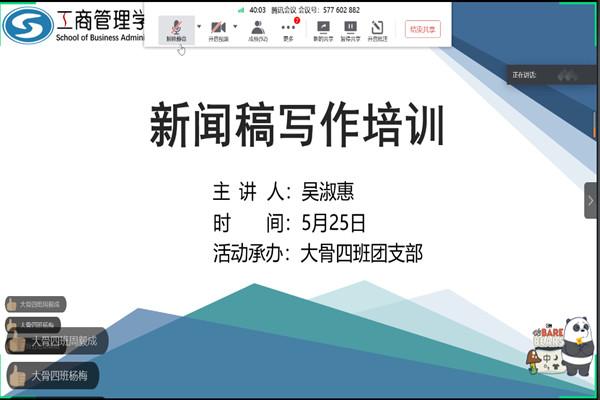 为提升工商第九届大骨班学员的宣传技能,锻炼学员的新闻稿撰写能力,5月25日下午,工商管理学院第九届“工商之星”大学生骨干培训班新闻稿培训课程于线上开展。本次培训课程邀请工商管理学院团委学生副书记,记者团、权益部常委吴淑惠作为主讲嘉宾。