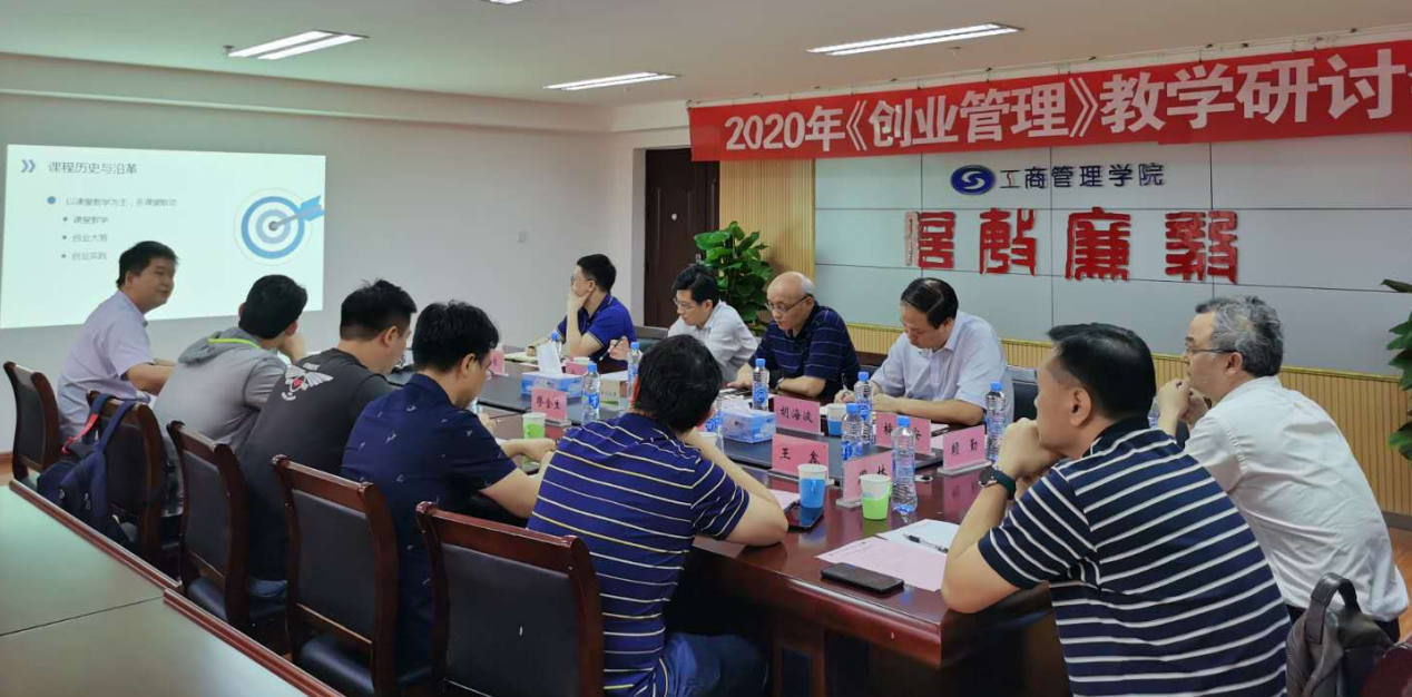 7月8日下午,由工商管理学院、MBA教育学院、创业教育学院联合举办的2020年《创业管理》教学研讨会在英孚大楼503会议室顺利举行。出席会议的有工商管理学院首席教授、《创业管理》课程负责人胡宇辰,工商管理学院院长胡海波,MBA教育学院院长宁亮,创业教育学院院长梅小安、副院长王昊,教务处副处长蔡前,工商管理学院副院长陆淳鸿,MBA学院外聘创业导师、中科心客CEO缪金生博士以及《创业管理》课程组教师。会议由胡宇辰主持。